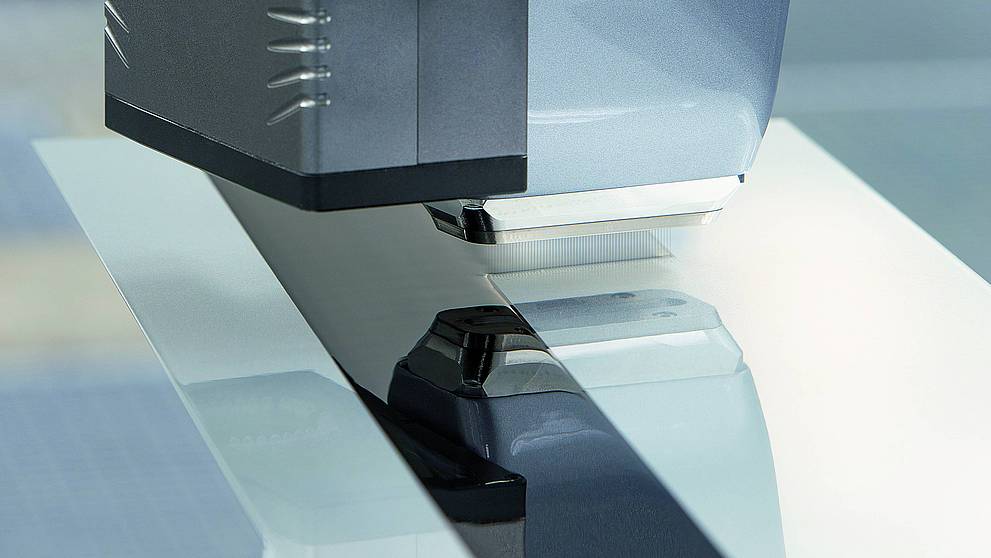 The paint is applied through these holes in parallel jets from a distance of 30 millimeters – similar to an ink-jet printer. Prior to this, a measuring system measures the surface using a camera. Based on the measuring data, a software program calculates the paint paths along which the applicator hovers over the surface. The speed and tilt angle of the applicator are controlled such that the paint is applied evenly at all times. The contours of the surface are also taken into account, which is important when painting car roofs, for example.