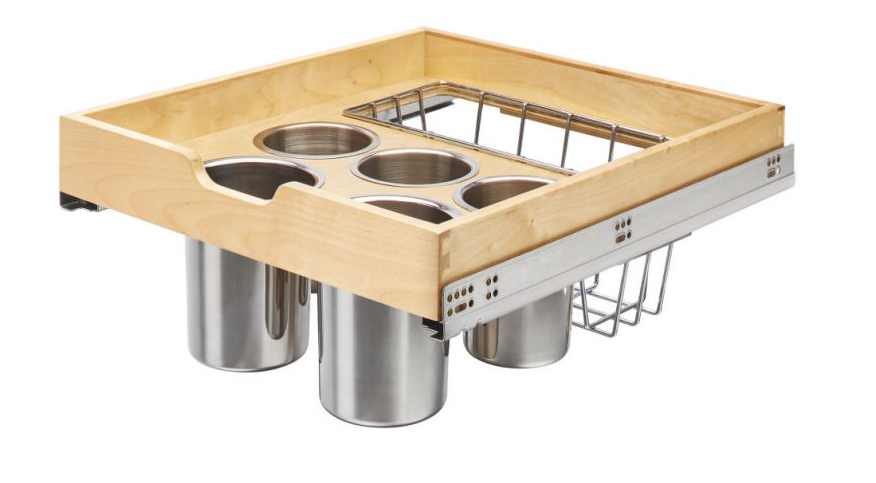 At IWF 2022, Rev-a -Shelf showed our pilaster utensil pullout. If you need a place to put your utensils, we have the ideal customizable solution with our 4PUT Series Pilaster Pullout. Designed for use with our pilaster system rails*, they fit 18″ or 24″ base cabinets, are made of natural maple and feature up to five stainless bins, a chrome wire basket and two small compartments ideal for smaller utensils.