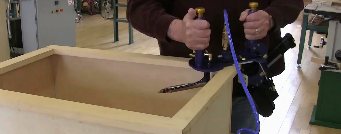 Its operation is intuitive: users load a rack of 1″ x 1/4″ crown staples into the carriage, then attach a 1/4″ air line onto the quick release nipple. Press the first button to align and clamp the face frame to the cabinet box. Press the second button and the staple is automatically driven at an angle, securing the face frame to the box.