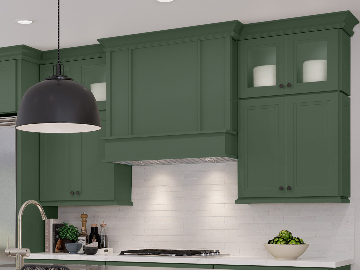 The full overlay detailed shaker door has a flat center panel, with the option of a slab or five-piece drawer front. The introduction of green paint comes on the heels of a recent color addition of painted navy. Both are offered in response to recent customer preferences for bolder, on-trend cabinets.