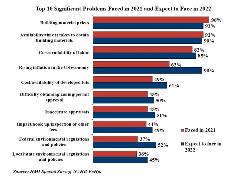 Availability and the time it takes to obtain building materials was also a predominant issue for the large majority of home builders, according the National Association of Home Builders, and most expect it will remain an issue in 2022. NAHB says the high incidence of builders reporting material problems is not surprising given recent increases in prices.