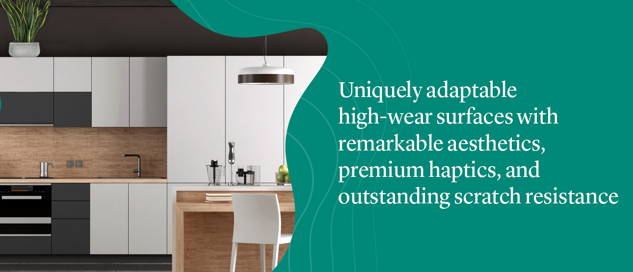 Unlike surfaces produced with an excimer process, Arrio will offer a uniquely customizable surface texture, including various flat finishes and textures with multiple gloss levels, such as wood or stone designs. The manufacturing process provides 100 percent consistency, order to order, in texture, gloss, touch and function. Arrio provides a superior solution over existing concepts because of its endless potential for customization. It also provides superior haptics, including super matte, smooth touch and high-color intensity surfaces, and it is suitable for single radius wrapping applications.