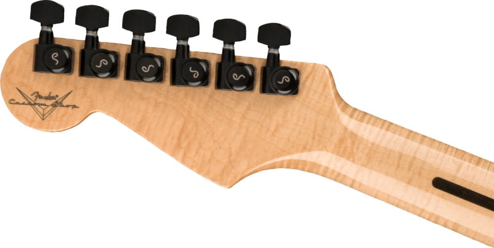 The neck is fashioned from beautiful 3A flame maple and finished in high-gloss urethane, imparting a hint of Fender woodworking tradition in contrast with the instrument’s other advanced visual elements. The fretboard is made of deep-blue polished Richlite, a composite material consisting of 70 percent reclaimed paper and resins. Popular as an architectural panel, it withstands moisture and has been used for interior projects.
